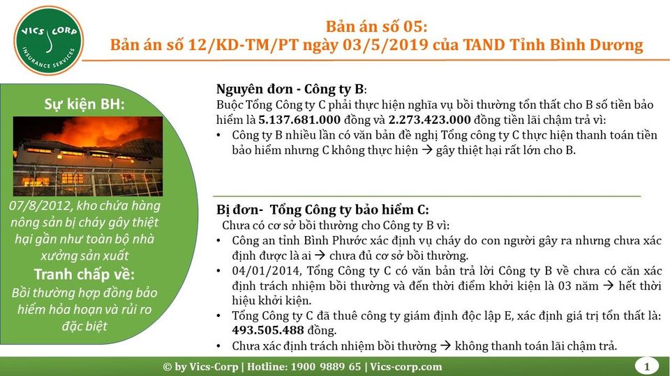 Ngày 07/8/2012, kho chứa hàng nông sản của Công ty B xảy ra sự cố cháy làm thiệt hại gần như toàn bộ nhà xưởng sản xuất của Công ty B. Khi xảy ra sự cố cháy thì bảo vệ kho hàng cùng người dân đã báo cháy cho lực lượng phòng cháy chữa cháy đến khắc phục sự cố nhưng hàng hóa trong kho và diện tích nhà xưởng bị cháy sập hoàn toàn một phần, phần còn lại thì bị hư hỏng nặng. Ngay sau khi xảy ra sự việc, Công ty B đã thông báo cho Tổng Công ty C đến hiện trường để xem xét. Sau khi cơ quan công an bàn giao lại hiện trường vụ cháy (sau ngày xảy ra cháy khoảng 15 tháng) cho Công ty B thì hiện trạng nhà xưởng phần lớn đã bị hư hỏng, đổ sập, một phần thì bị hư hại nặng không thể tiếp tục sử dụng nếu không gia cố lại. Công ty B đã nhiều lần có văn bản đề nghị Tổng Công ty C thực hiện việc thanh toán tiền bảo hiểm cho Công ty B nhưngTổng Công ty C không thực hiện. Việc Tổng Công ty C không thực hiện thanh toán tiền bảo hiểm kịp thời đã gây thiệt hại rất lớn đối với Công ty B. Vì vậy, Công ty B khởi kiện đối với Tổng Công ty C đề nghị Tòa án nhân dân thành phố A giải quyết các vấn đề như sau:
