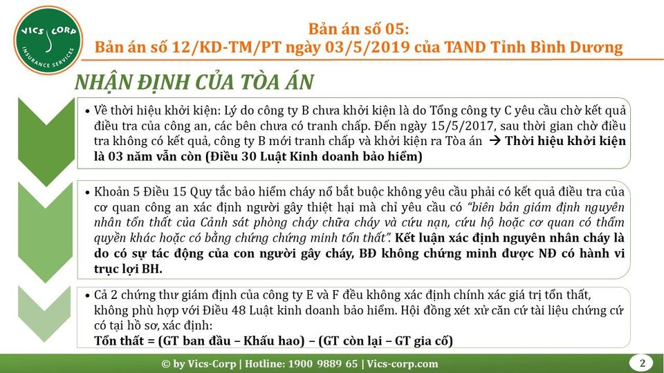 2.1. Chấp nhận một phần yêu cầu khởi kiện của Công ty TNHH Thương mại Dịch vụ B đối với Tổng Công ty Cổ phần C (C) về việc tranh chấp Hợp đồng bảo hiểm hỏa hoạn và các rủi ro đặc biệt số 12/BDU/BPH/3120/034.