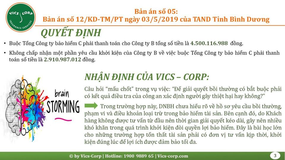 - Buộc Tổng Công ty C phải thực hiện việc bồi thường bảo hiểm theo Hợp đồng bảo hiểm hỏa hoạn và các rủi ro số 12/BDU/BPH/3120/034 ngày 23/7/2012 và Giấy chứng nhận bảo hiểm hỏa hoạn và các rủi ro đặc biệt số 12/BDU/BPH/3120/034 ngày 23/7/2012 đã cấp cho Công ty B với số tiền là 7.333.301.000đồng, đã trừ mức miễn trừ theo cam kết của hợp đồng bảo hiểm là 5.000.000đồng.