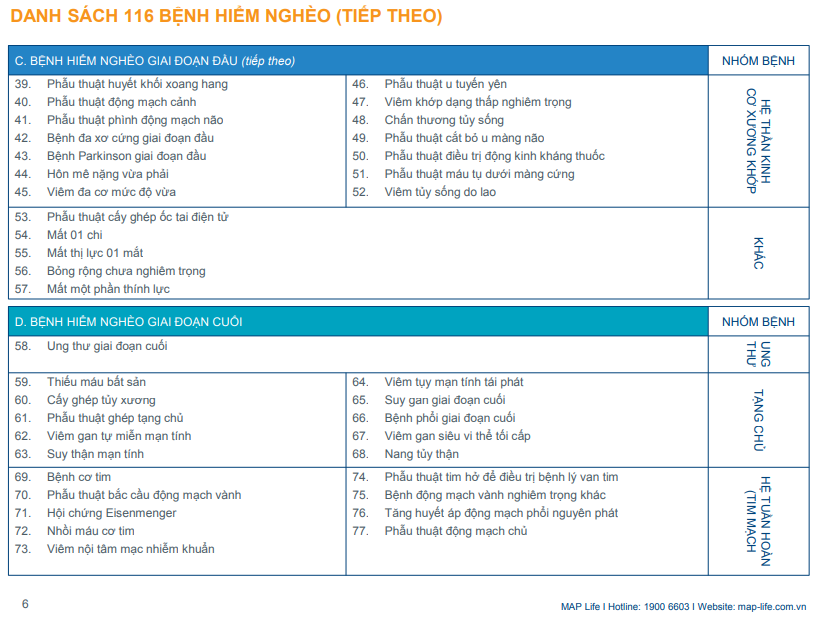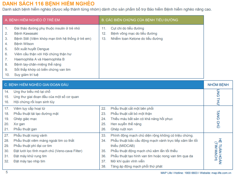Maplife chia danh sách 116 bệnh hiểm nghèo thành 02 giai đoạn (gian đoạn đầu và giai đoạn cuối) với 05 nhóm bệnh khác nhau (Nhóm bệnh ung thư; nhóm bệnh tạng chủ; nhóm bệnh hệ tuần hoàn - tim mạch; nhóm bệnh hệ thần kinh cơ xương khớp; nhóm bệnh khác).