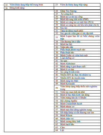 Các bệnh điển hình của hệ thần kinh như: Bệnh Alzheimer; Bệnh Parkinson; Hôn mê; Thần kinh ngoại biên; Bệnh tế bào thần kinh vận động; Động kinh; Bệnh xơ cứng rải rác các giai đoạn; Tổn thương não; Phẫu thuật ghép tủy xương,.v.v..
