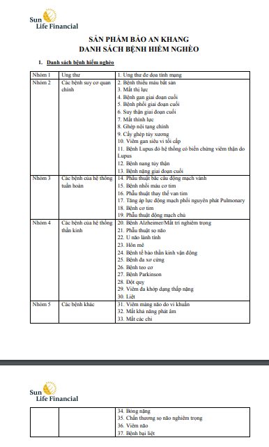 Ví dụ 4: Danh sách bệnh hiểm nghèo của Sunlife.
