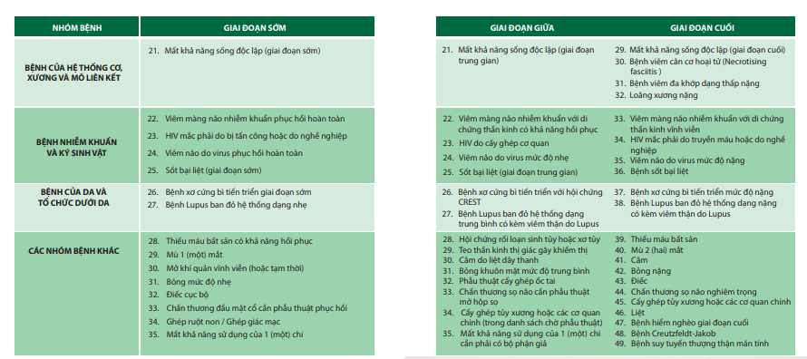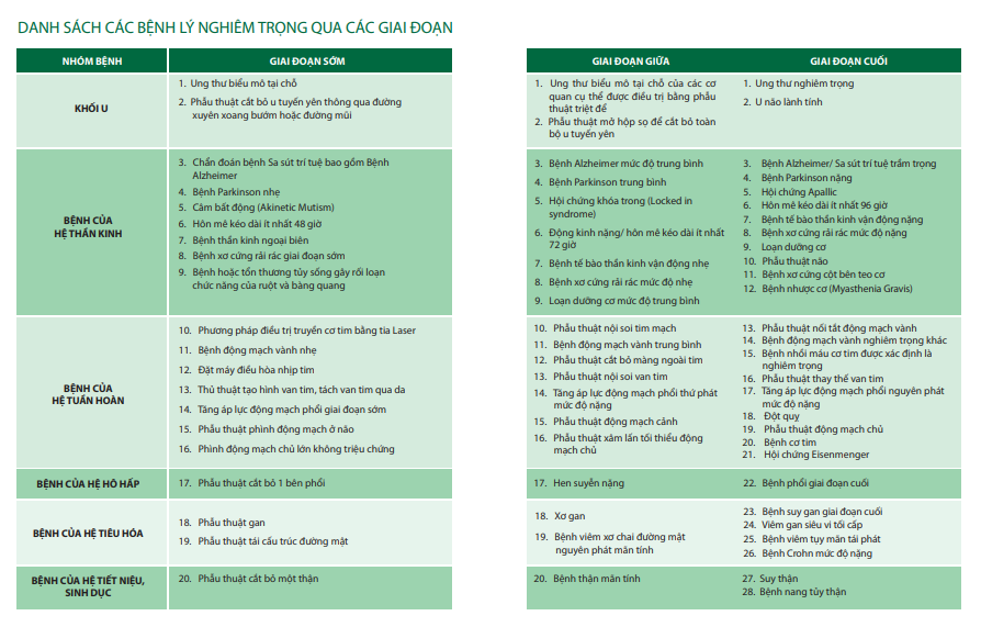 - Đối với bệnh ung thư: Giai đoạn sớm - Ung thư biểu mô tại chỗ; Giai đoạn giữa - Ung thư biểu mô tại chỗ của các cơ quan cụ thể được điều trị bằng phẫu thuật triệt để; Giai đoạn cuối - Ung thư nghiêm trọng. b) Chia danh sách bệnh thành 02 giai đoạn: Danh sách bệnh giai đoạn đầu; Danh sách bệnh giai đoạn sau.