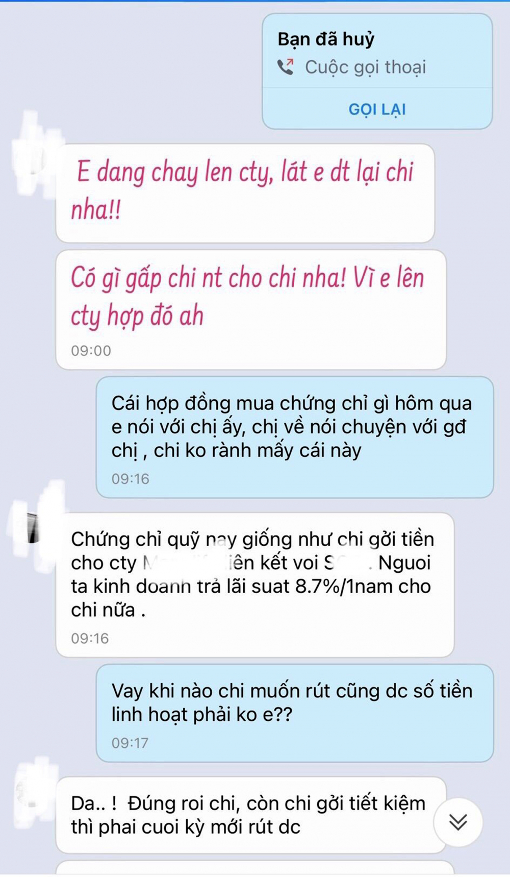 Theo những tin nhắn của nhân viên Ngân hàng S. mà chị P. cung cấp, nhân viên này giới thiệu đó là sản phẩm chứng chỉ quỹ của Công ty M. liên kết với Ngân hàng S. chứ không nhắc gì đến cụm từ BHNT. Nhưng khi khách hàng phản ứng, Ngân hàng S. đẩy toàn bộ trách nhiệm sang Công ty M. Chị P. đã gửi khiếu nại đến Công ty M. từ 3 tháng trước nhưng đến nay, công ty vẫn chưa trả lời.