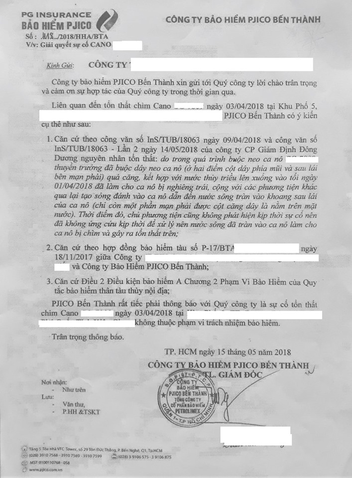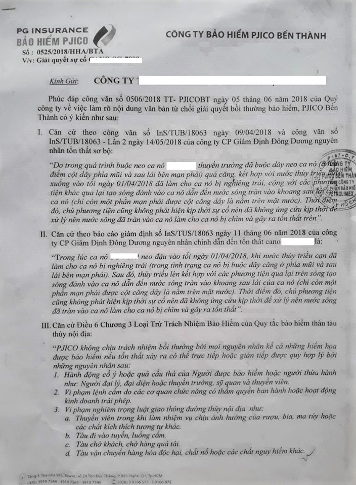 Ngày 21/06/2018, PJICO Bến Thành ban hành văn bản số 0525/2018/HHA/BTA thông báo từ chối bồi thường lần 2 với lý do “Căn cứ vào tình hình tổn thất thực tế và báo cáo giám định nguyên nhân tổn thất nằm vào điểm loại trừ “Tàu bị mắc cạn bởi ảnh hưởng của thủy triều hoặc con nước lên xuống” (dựa trên Điều 6 Chương 3 Loại trừ trách nhiệm bảo hiểm của Quy tắc bảo hiểm thân tàu thủy nội địa).