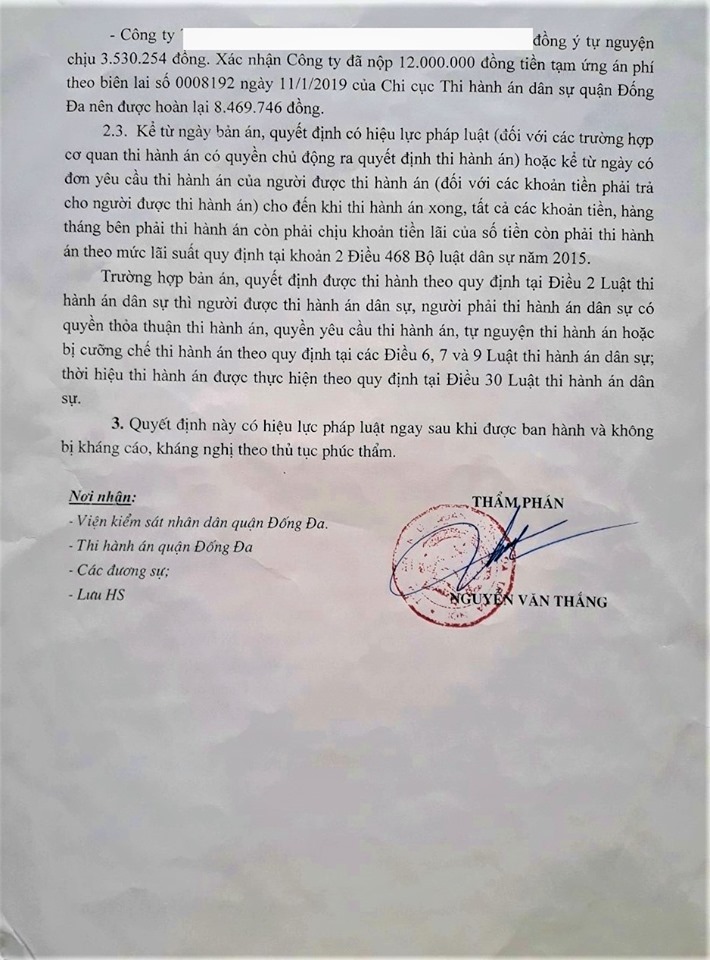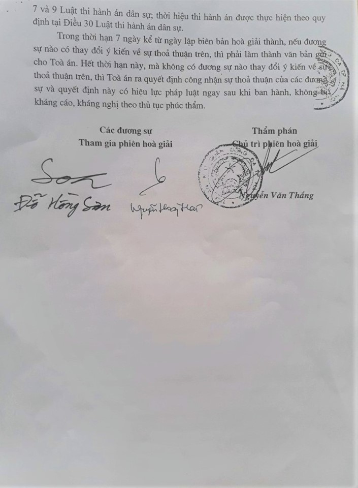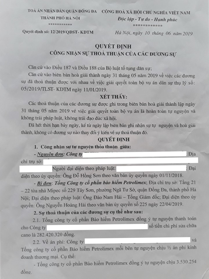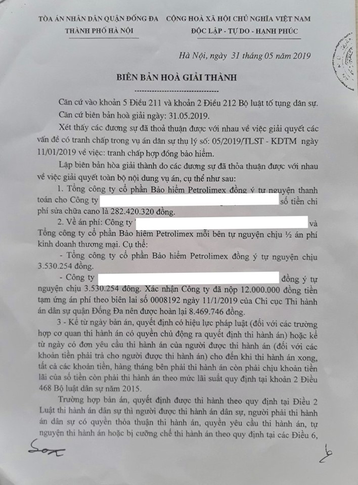 Sau nhiều lần trao đổi và làm việc tại Tòa án nhân dân quận Đống Đa, hai bên trong vụ việc đã đi đến quyết định tiến hành hòa giải tại Tòa án và thỏa thuận được với nhau về việc giải quyết toàn bộ nội dung vụ án. Theo đại diện của Công ty T có mặt tại phiên hòa giải, hai bên đã thỏa thuận và thống nhất rằng số tiền 282 triệu đồng là số tiền sửa chữa hợp lý do căn cứ vào báo cáo giám định. Kết quả của buổi hòa giải đã được Tòa án ghi nhận và lập Biên bản hòa giải thành cùng với ban hành Quyết định Công nhận sự thỏa thuận của các đương sự. Hai bên có nghĩa vụ thi hành Quyết định trên bao gồm việc PJICO Bến Thành phải thanh toán cho Công ty T chi phí sửa chữa ca nô là 282 triệu đồng và mỗi bên tự nguyện chịu một nửa tiền án phí.