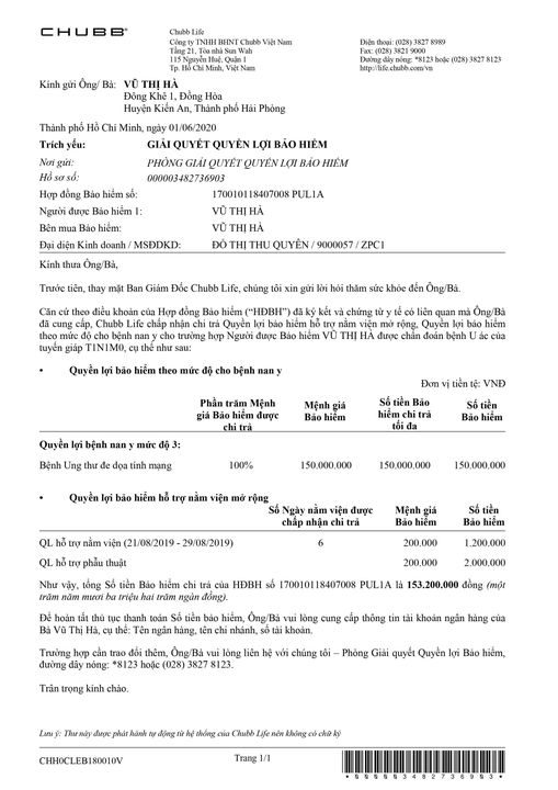Chúc mừng khách hàng Vũ Thị Hà- Đông Khê, Hải Phòng đã nhận được số tiền chi trả của bảo hiểm Chubb life theo quyền lợi bệnh ung thư của mình. Chúng tôi rất cám ơn các khách hàng đã tin tưởng lựa chọn sử dụng dịch vụ hỗ trợ giải quyết bồi thường của VICS-CORP.