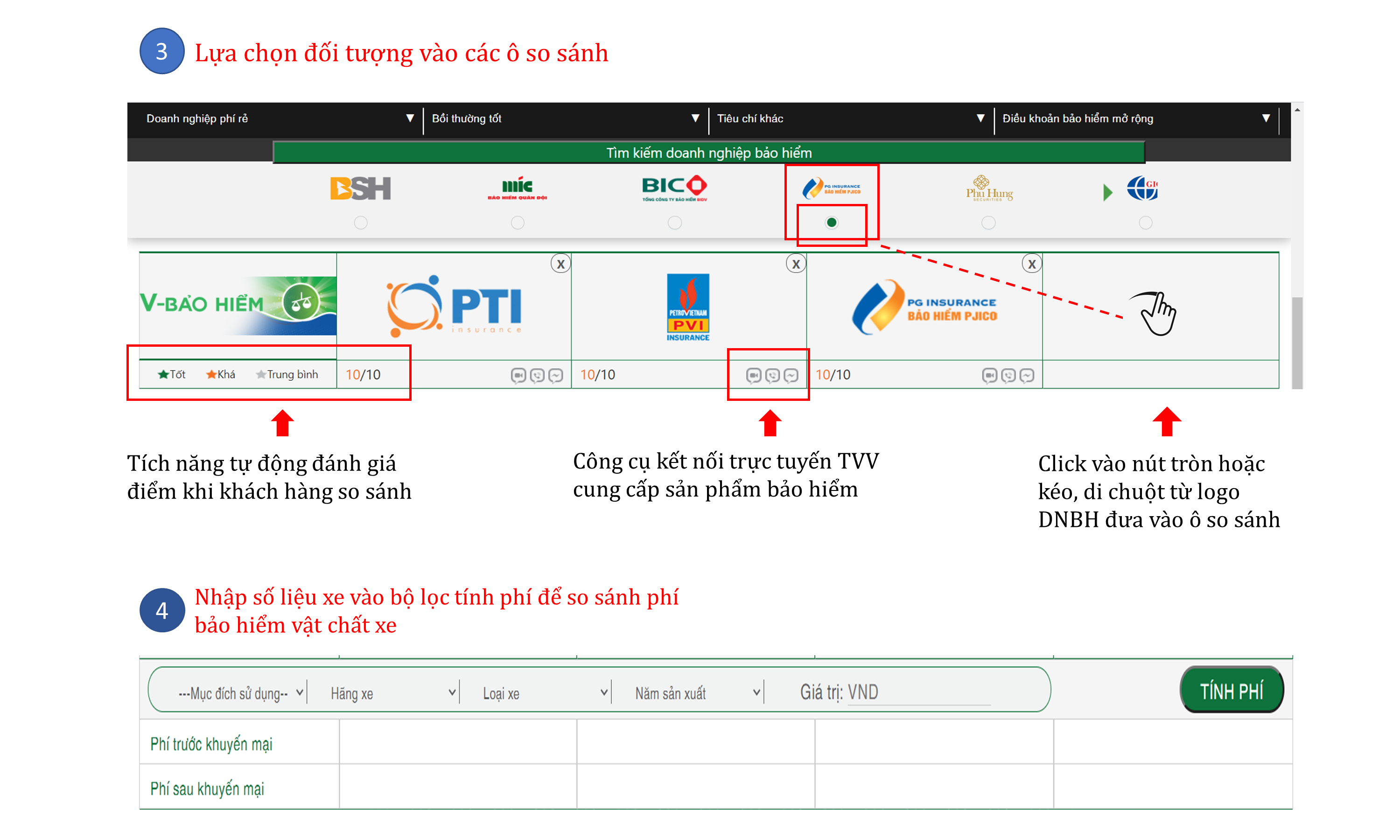 Khách hàng lựa chọn đối tượng vào ô so sánh bằng cách click vào ô tròn hiển thị tại logo/ ảnh sản phẩm hoặc trực tiếp dùng chuột kéo thả logo/ảnh sản phẩm vào ô so sánh.