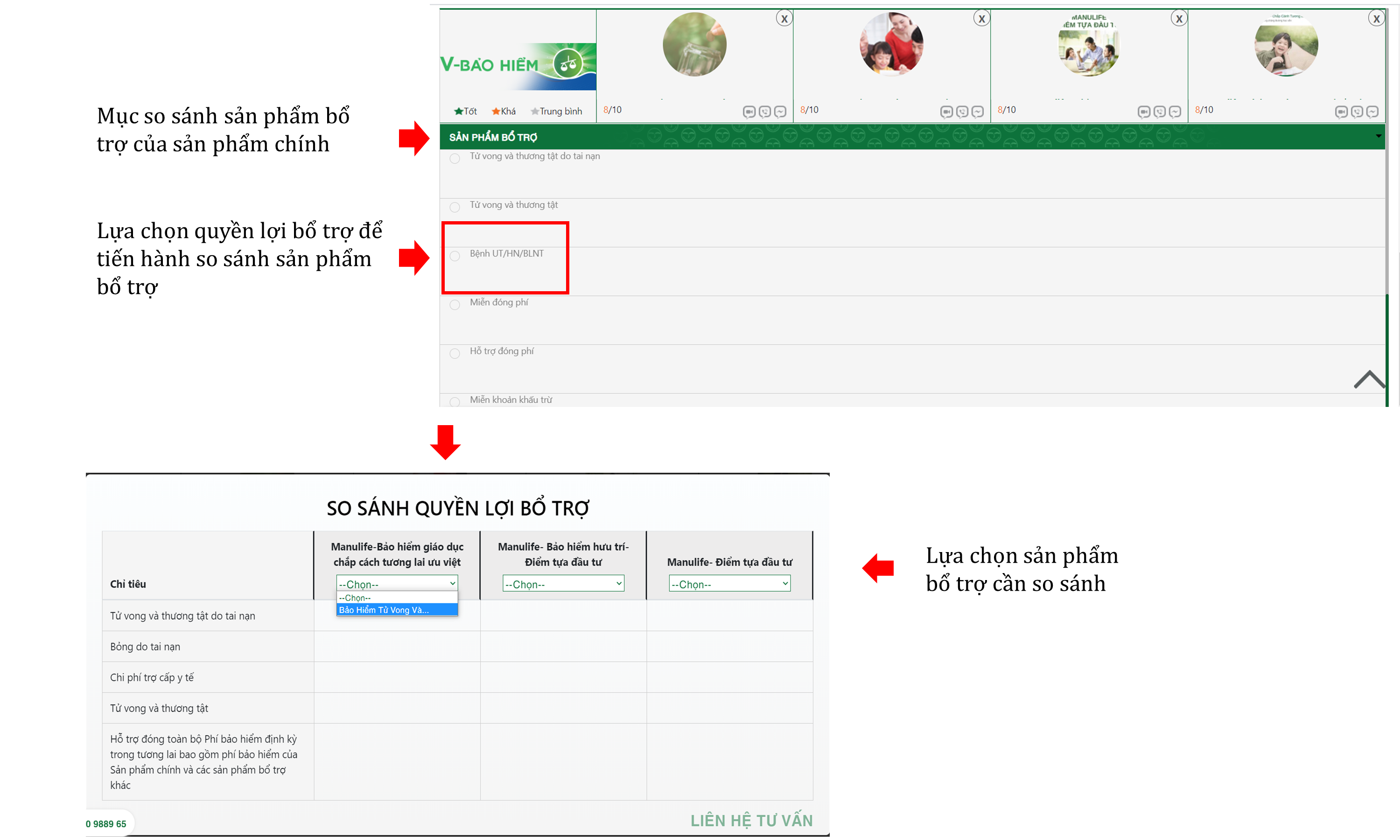 Đối với trang so sánh nhân thọ. Tại mục sản phẩm bổ trợ, khách hàng lựa chọn quyền lợi bổ trợ phù hợp để tiến hành so sánh sản phẩm bổ trợ của các sản phẩm chính với nhau