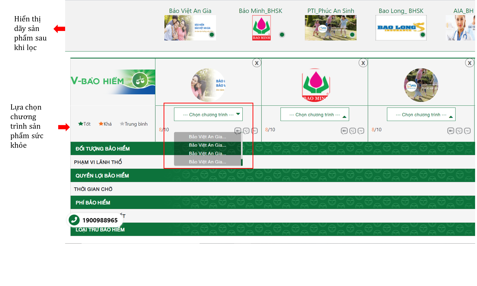 Đối với trang so sánh sức khỏe. Khách hàng có thể lựa chọn so sánh đến từng chương trình/ gói sản phẩm với nhau.