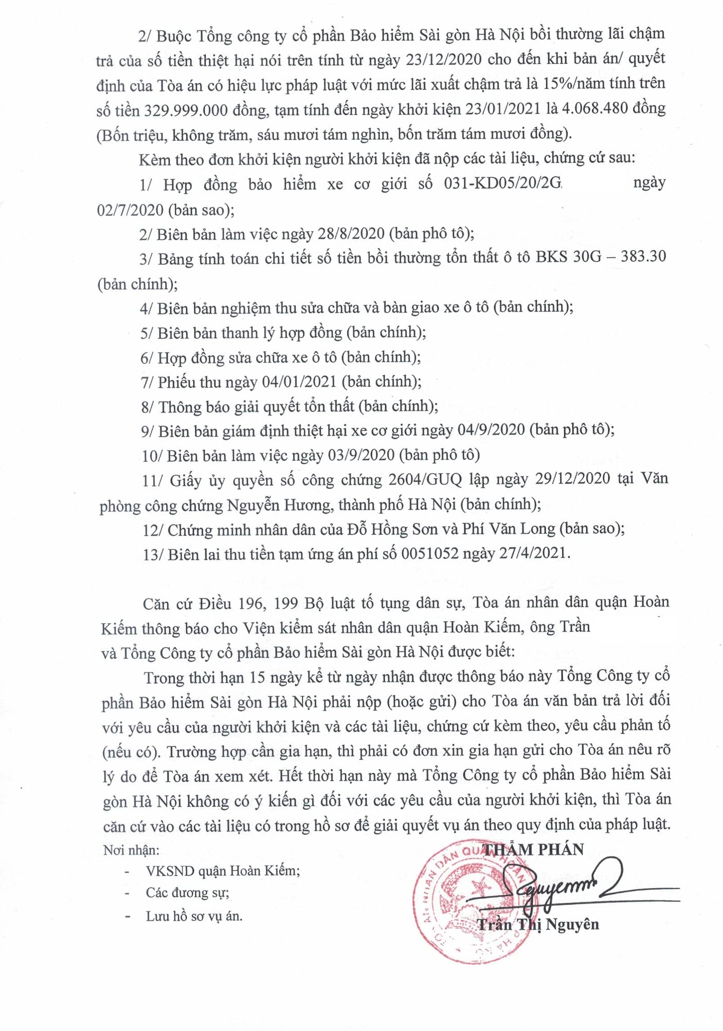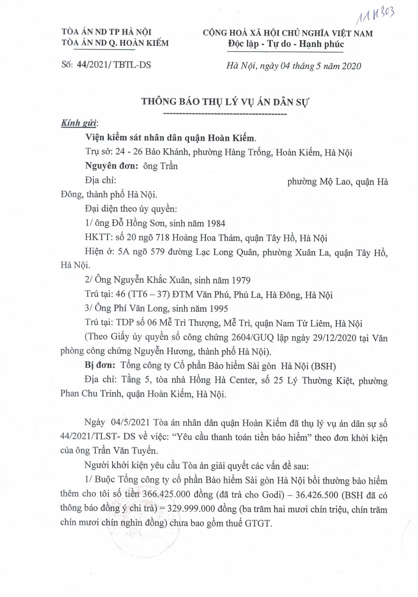 Thông báo thụ lý vụ án dân sự số: 44/2021/TBTL-DS ngày 04/05/2020 của Tòa án nhân dân quận Hoàn Kiếm về tranh chấp "Hợp đồng bảo hiểm" giữa ông Trần... và Tổng Công ty Bảo hiểm Sài Gòn Hà Nội - BSH