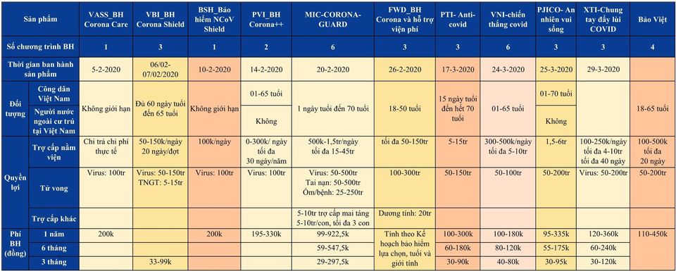 Hàng loạt các sản phẩm bảo hiểm PNT ra đời như Corona Care của VASS, Corona++ của PVI, Corona Shield của VBI… Mỗi gói bảo hiểm được quy định cụ thể thời gian bảo hiểm trong khoảng 3-6 tháng đến 1 năm, DNBH đã có tính toán cho các sản phẩm nhằm phù hợp với nhiều đối tượng, nhu cầu của khách hàng.