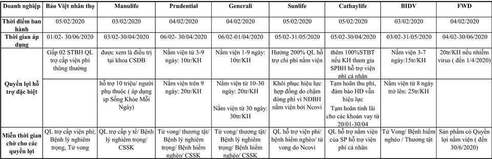 Trong thông báo của các DNBH, có thể nhận ra rằng những điểm chung đó là, miễn thời gian chờ, ưu tiên giải quyết quyền lợi, đồng thời chấp nhận chi trả các quyền lợi về tử vong, bệnh hiểm nghèo, các chi phí y tế…liên quan đến Covid – 19. Bên cạnh đó, một vài doanh nghiệp cũng có thêm những khoản tiền mặt hỗ trợ đặc biệt để dành tặng khách hàng để khách hàng có thêm sự yên tâm khi điều trị dịch bệnh. Với những khoản hỗ trợ đặc biệt này thì chúng tôi đã lập nên một bảng thống kê so sánh để độc giả tiện theo dõi.