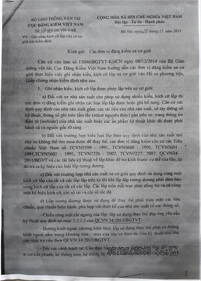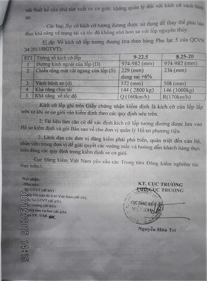 Tuy nhiên, không phải mọi thay đổi về thông số kỹ thuật thực tế của lốp so với thông số kỹ thuật của nhà sản xuất sẽ không được đăng kiểm. Ngày 25/12/2014, Cục Đăng kiểm Việt Nam đã có văn bản số 5740/ĐKVN-VAR (đính kèm) hướng dẫn các đơn vị đăng kiểm xe cơ giới về việc ghi nhận kích cỡ lốp tương đương được sử dụng để thay thế thỏa mãn các tiêu chuẩn, quy chuẩn hiện hành, phù hợp với thiết kế của nhà sản xuất về các thông số như chiều rộng cắt ngang của lốp, đường kính ngoài, vành bánh xe,… Theo đó được hiểu rằng lốp xe sau khi thay thế được đơn vị đăng kiểm ghi nhận trên Giấy Đăng kiểm thì Giấy đăng kiểm có hiệu lực pháp luật.